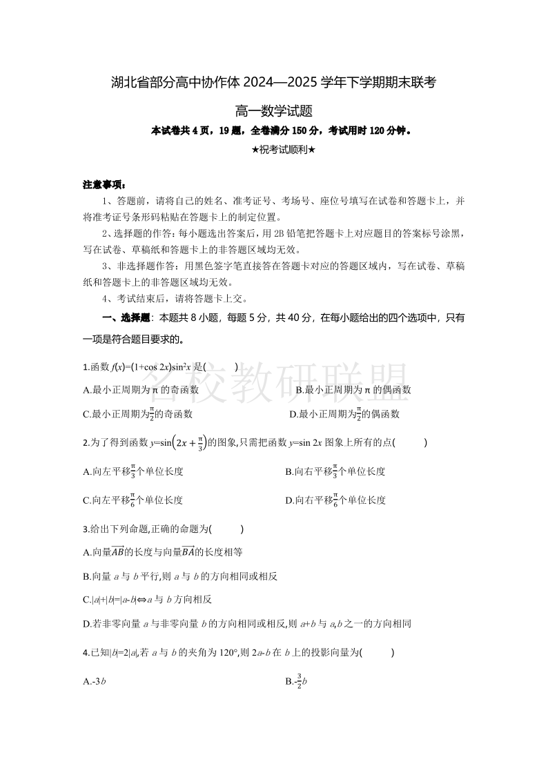 湖北省部分高中协作体2024-2025学年高一下学期期末联考 数学试卷(含答案).pdf