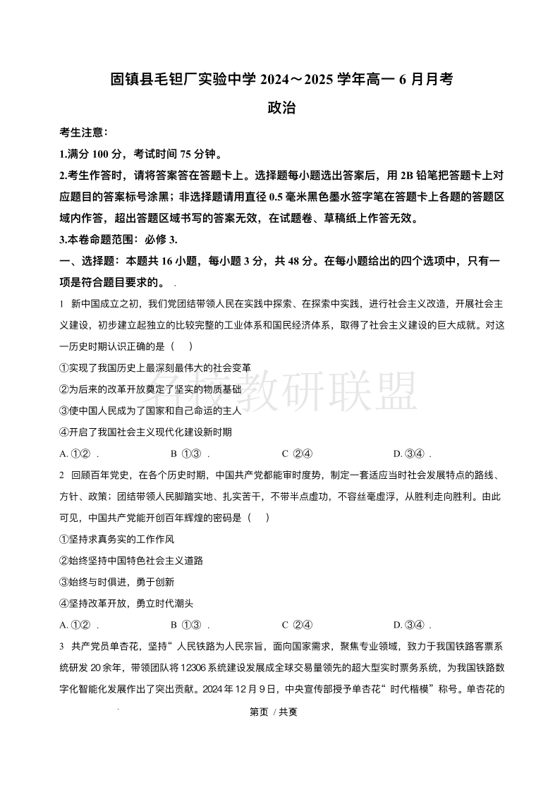 安徽省毛钽厂实验中学2024-2025学年高一下学期6月月考 政治试题(含答案).pdf