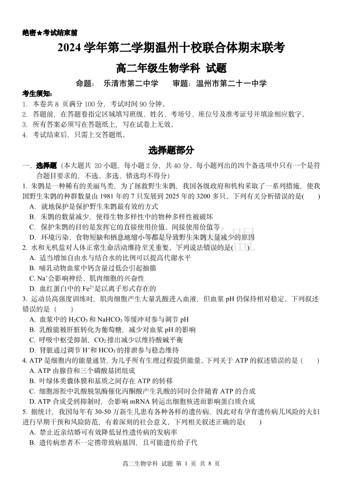 生物试题|2506温州十校期末联考.pdf
