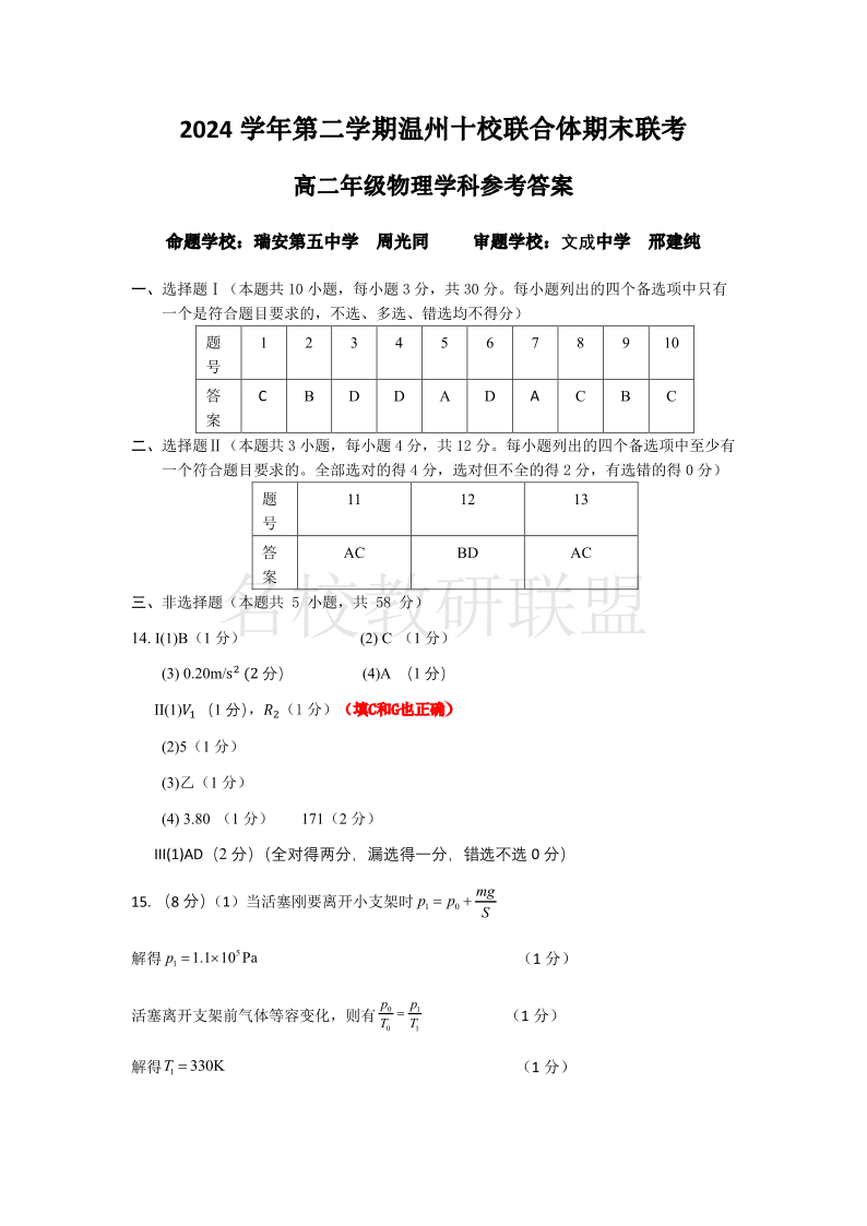 物理答案|2506温州十校期末联考.pdf