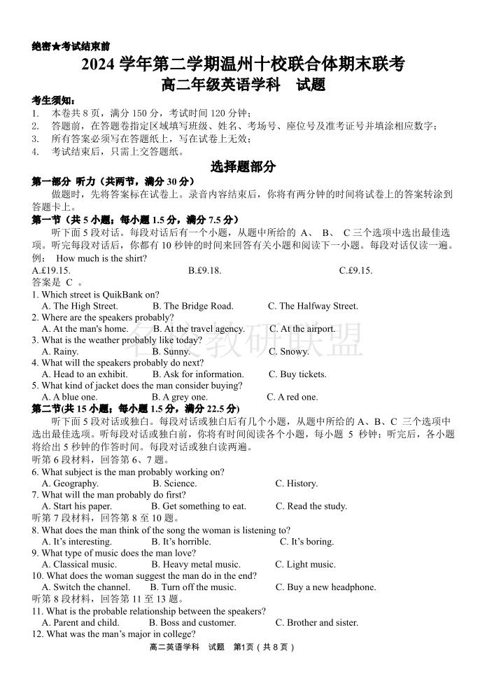 英语试题|2506温州十校期末联考.pdf