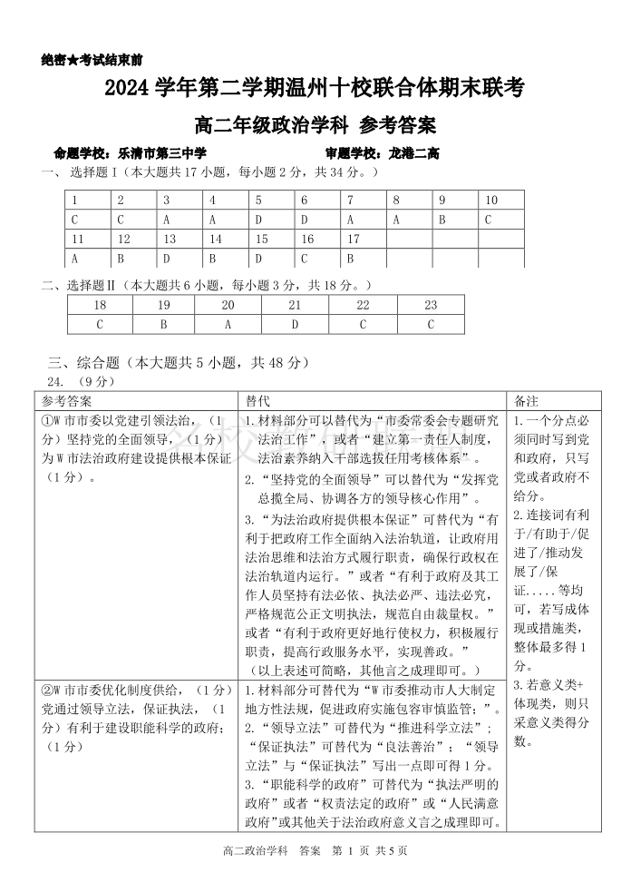 政治答案|2506温州十校期末联考.pdf