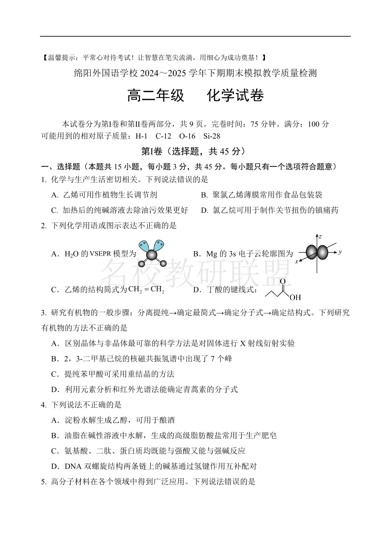四川省绵阳外国语学校2024-2025学年高二下学期期末模拟考试 化学试题(含答案).pdf