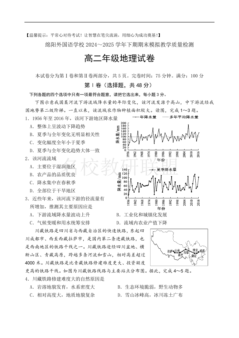 四川省绵阳外国语学校2024-2025学年高二下学期期末模拟考试 地理试题(含答案).pdf