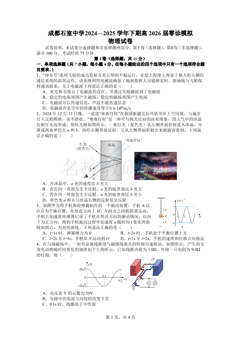 成都石室中学2024-2025学年度下期高2026届零诊模拟 物理试卷(含答案).pdf