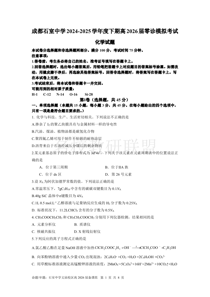 成都石室中学2024-2025学年度下期高2026届零诊模拟 化学试卷(含答案).pdf