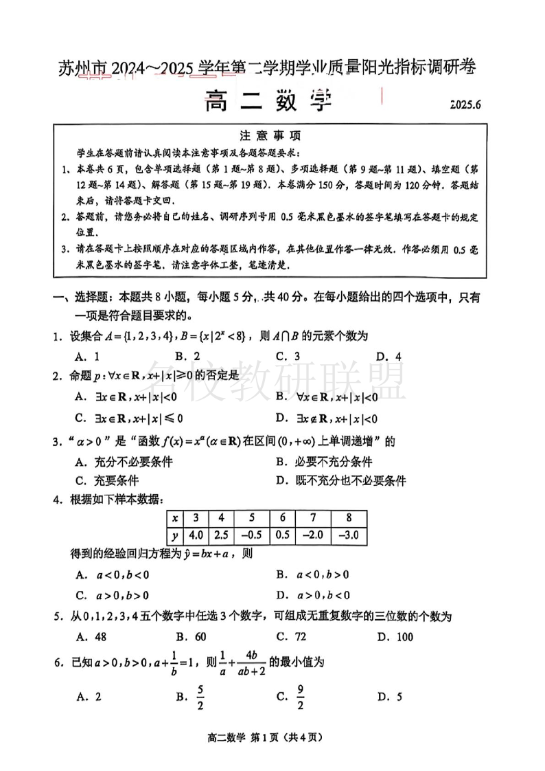 苏州市2024-2025学年高二下学期学业质量阳光指标调研 数学试卷(含答案).pdf