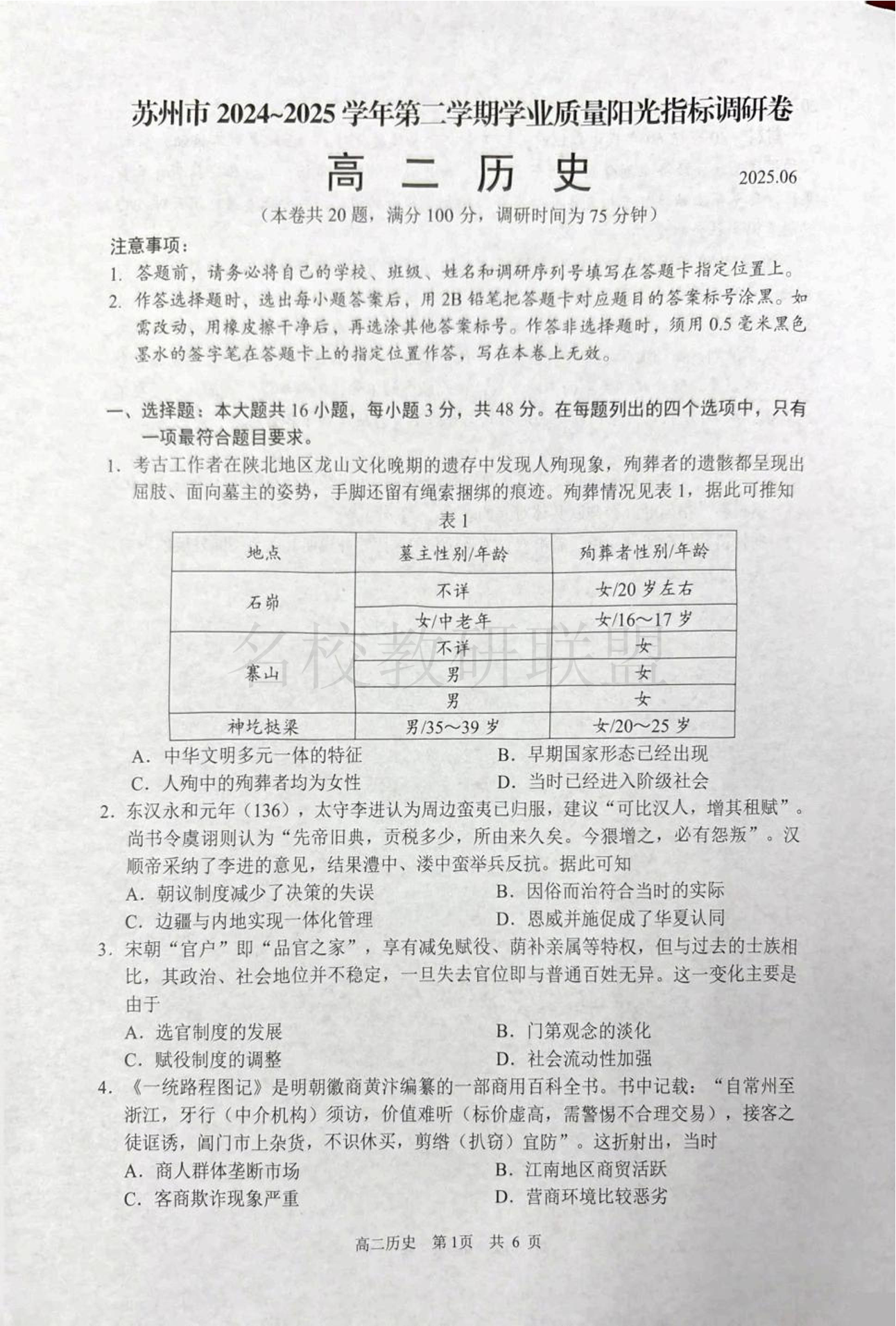 苏州市2024-2025学年高二下学期学业质量阳光指标调研 历史试卷(含答案).pdf