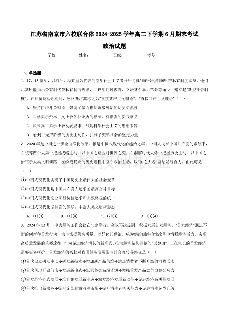 江苏省南京市2024-2025学年高二下学期六校联合体期末考试 政治试卷(含答案).pdf