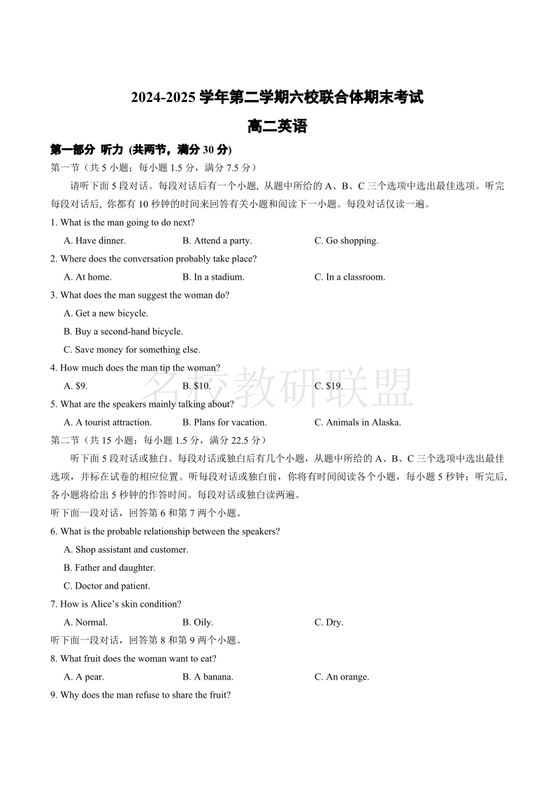 江苏省南京市2024-2025学年高二下学期六校联合体期末考试 英语试卷(含答案).pdf