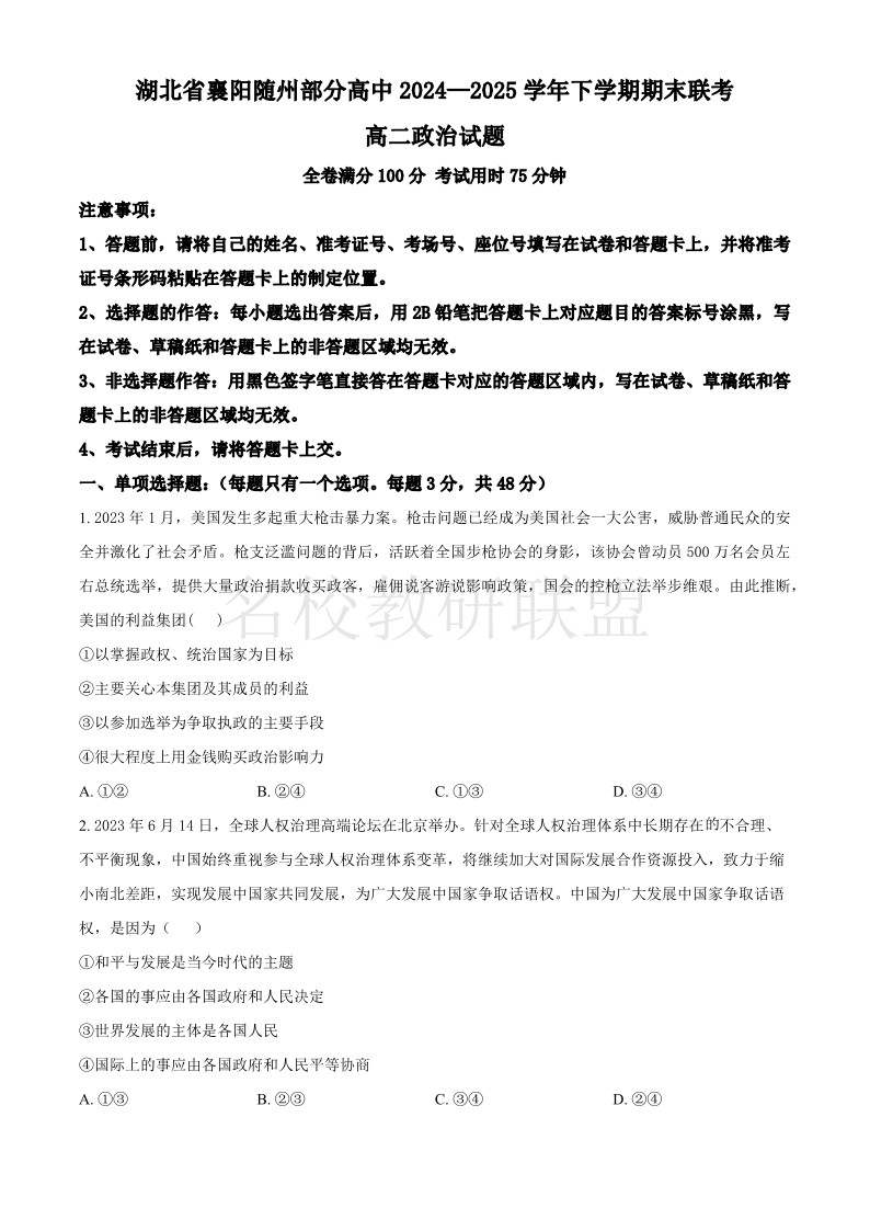 湖北省襄阳市随州部分高中2024-2025学年高二下学期期末联考 政治.pdf