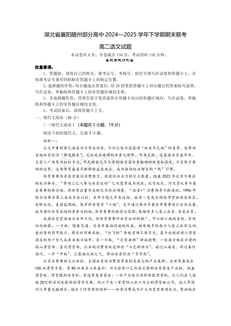 湖北省襄阳市随州部分高中2024-2025学年高二下学期期末联考 语文.pdf