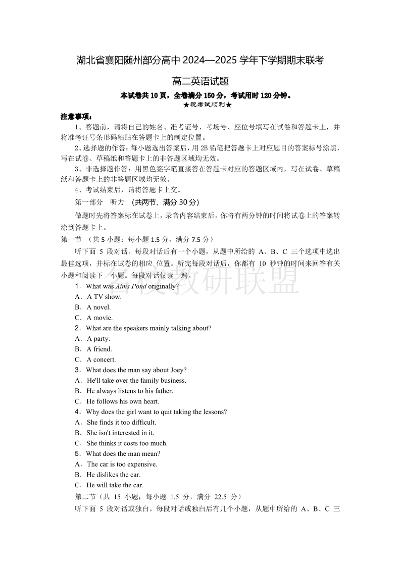 湖北省襄阳市随州部分高中2024-2025学年高二下学期期末联考 英语.pdf