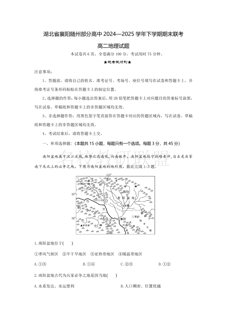 湖北省襄阳市随州部分高中2024-2025学年高二下学期期末联考 地理.pdf