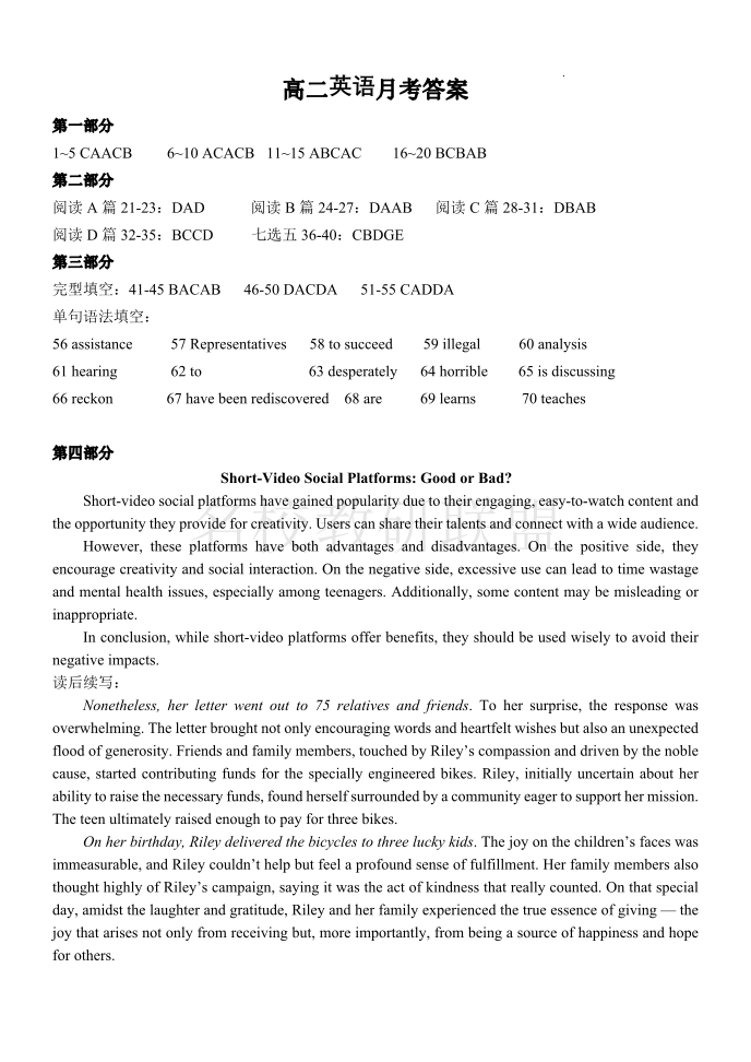 黑龙江省双鸭山市第一中学2024-2025学年高二下学期6月月考 英语答案.pdf