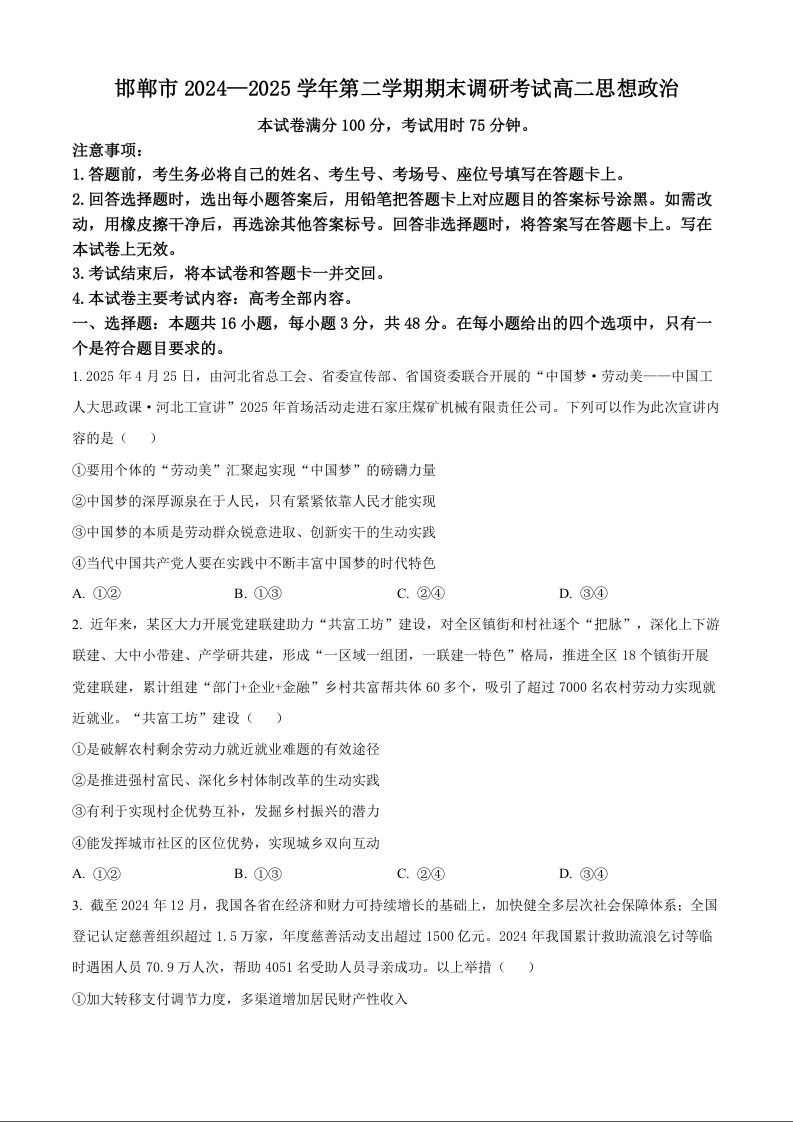 河北省邯郸市2024-2025学年高二第二学期期末调研考试 政治试题(含答案).docx