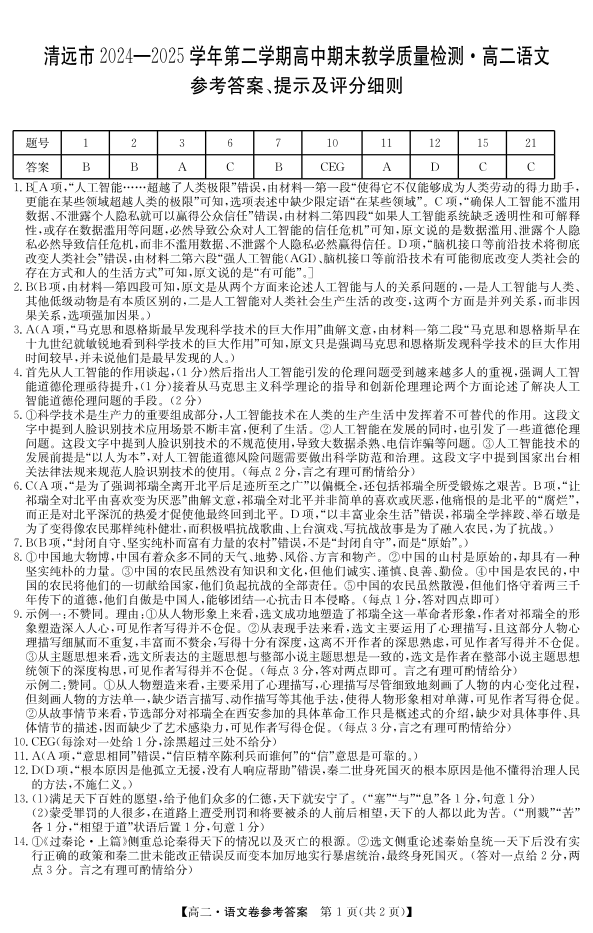 广东省清远市2024-2025学年高二下学期期末质检 语文答案.pdf