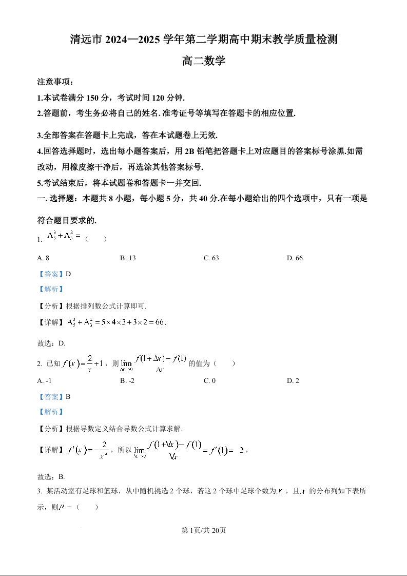 广东省清远市2024-2025学年高二下学期期末质检 数学答案.docx