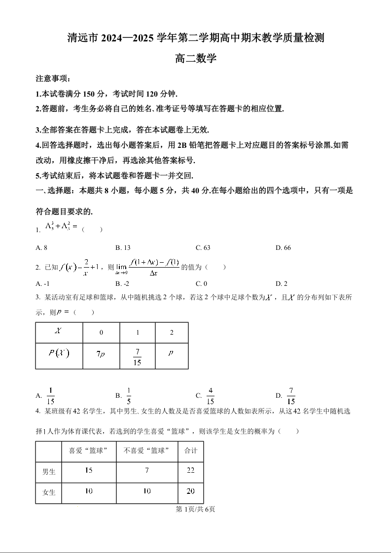 广东省清远市2024-2025学年高二下学期期末质检 数学.docx