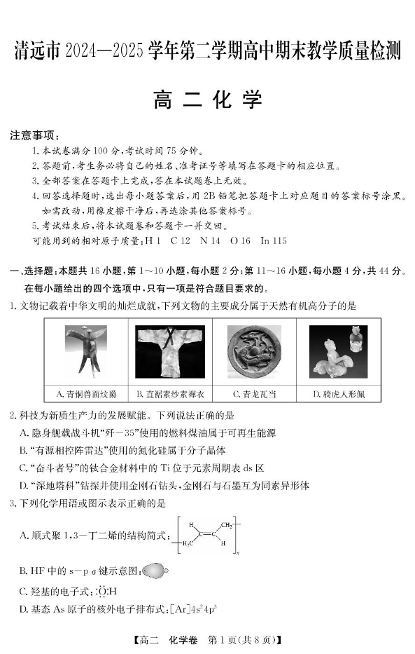 广东省清远市2024-2025学年高二下学期期末质检 化学.pdf