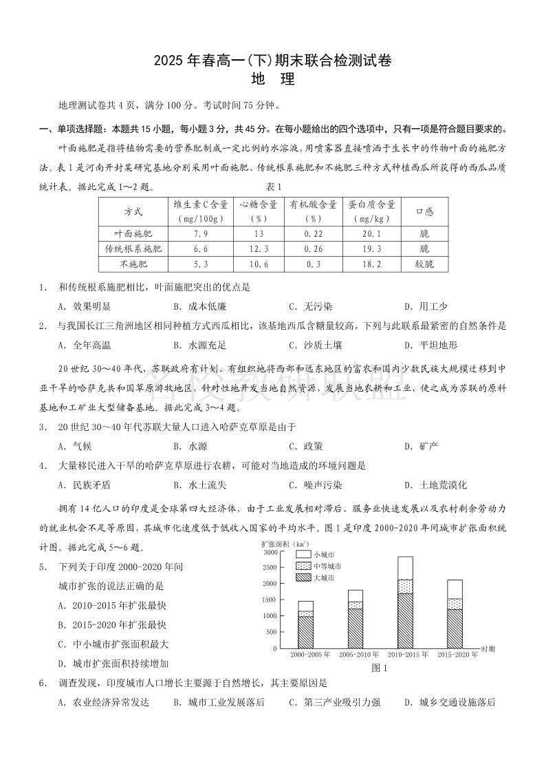 重庆市康德教育2025年春高一(下)期末联合检测 地理试卷(含答案).pdf