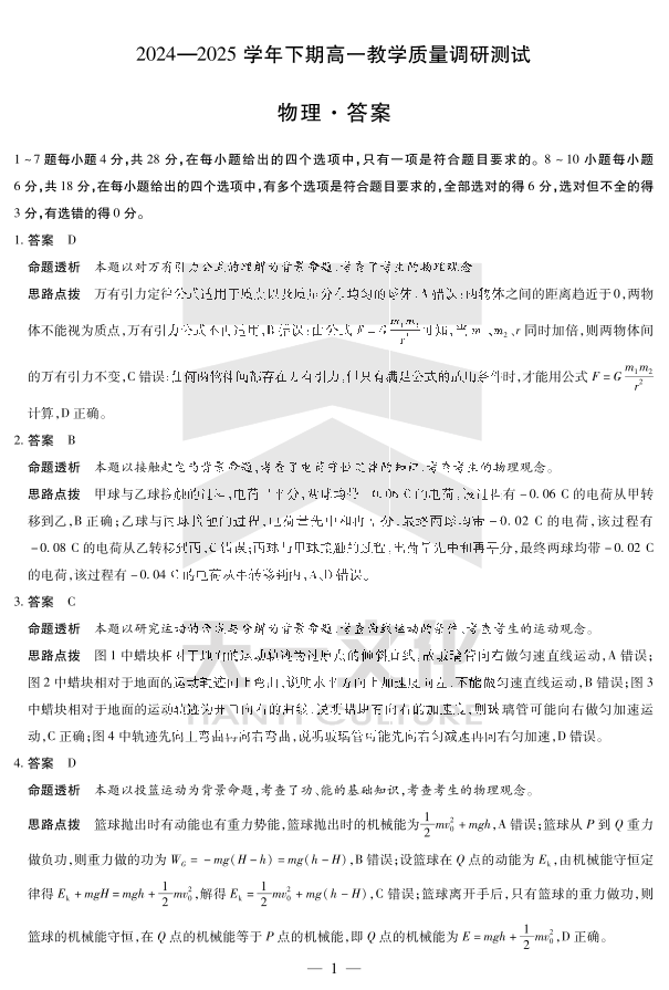 物理鹤壁高一下教学质量调研测试答案.pdf