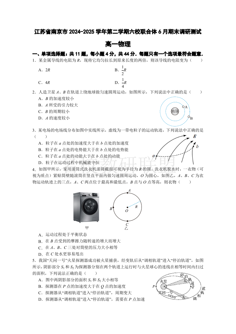 江苏省南京市2024-2025学年高一下学期六校联合体期末调研测试 物理试卷(含答案).pdf