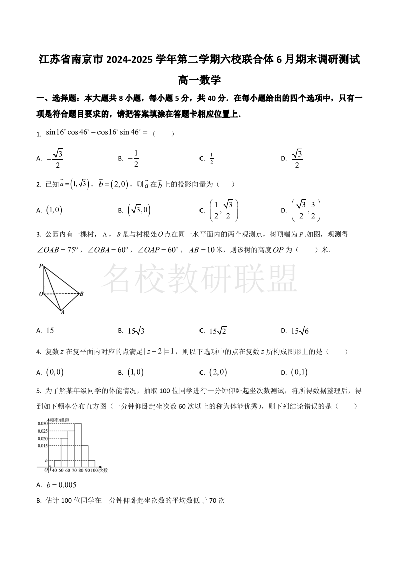 江苏省南京市2024-2025学年高一下学期六校联合体期末调研测试 数学试卷(含答案).pdf