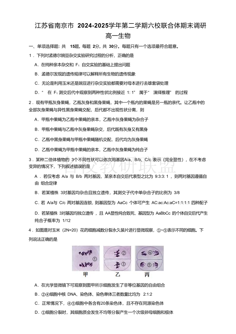 江苏省南京市2024-2025学年高一下学期六校联合体期末调研测试 生物试卷(有答案).pdf