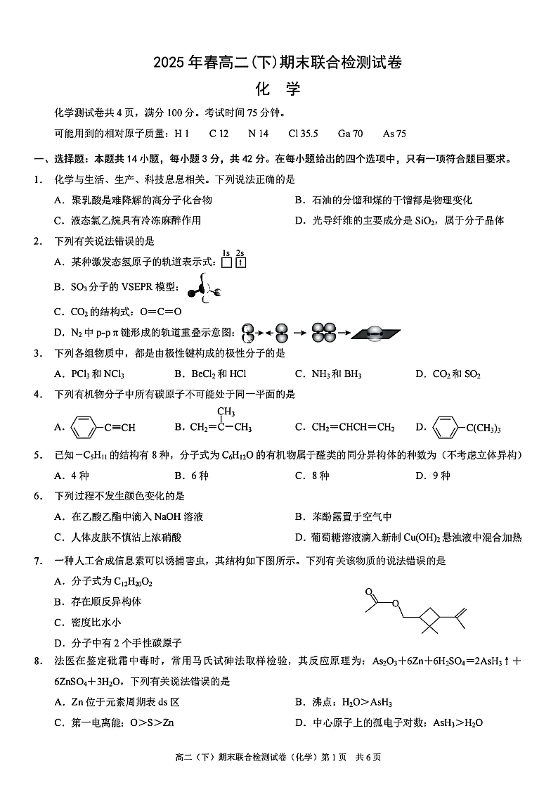 重庆市康德教育2025年春高二(下)期末联合检测试卷 化学试卷(含答案).pdf