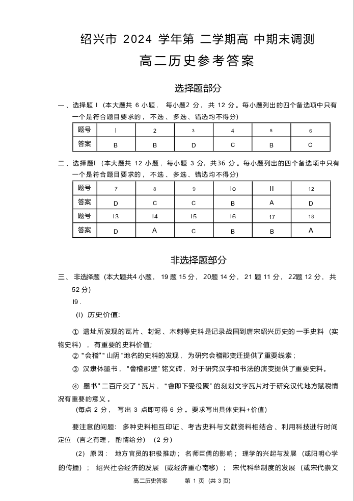 历史试题卷|2506绍兴高二下期末统考答案.docx