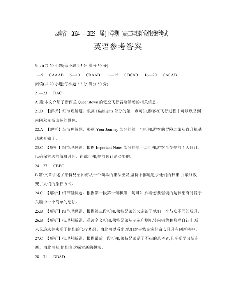 云南省曲靖市2024-2025届高二下学期阶段性诊断考试 英语答案.docx