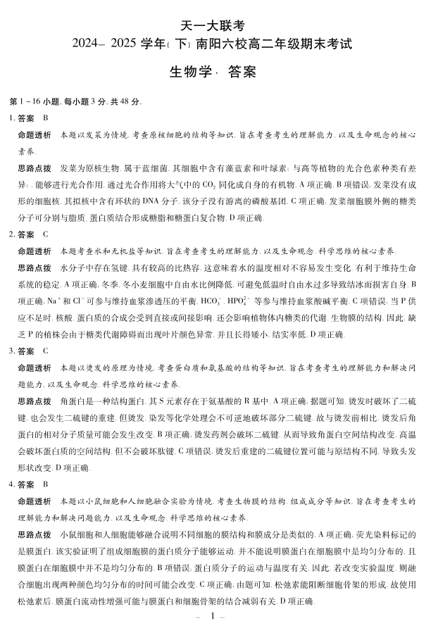 生物南阳六校高二下期末详细答案.pdf