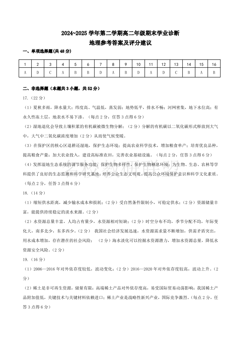 太原市2024-2025学年第二学期高二年级期末学业诊断 地理答案.pdf