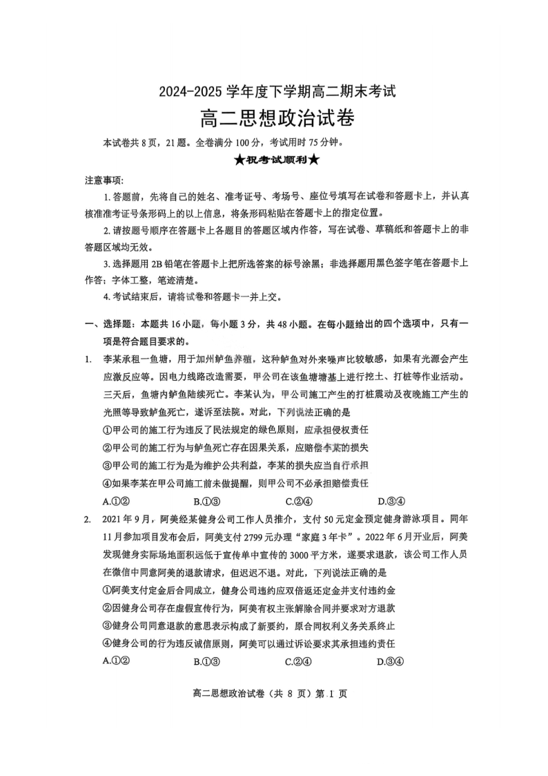 湖北省七市州2024-2025学年度下学期高二期末考试 政治试卷(含答案).pdf