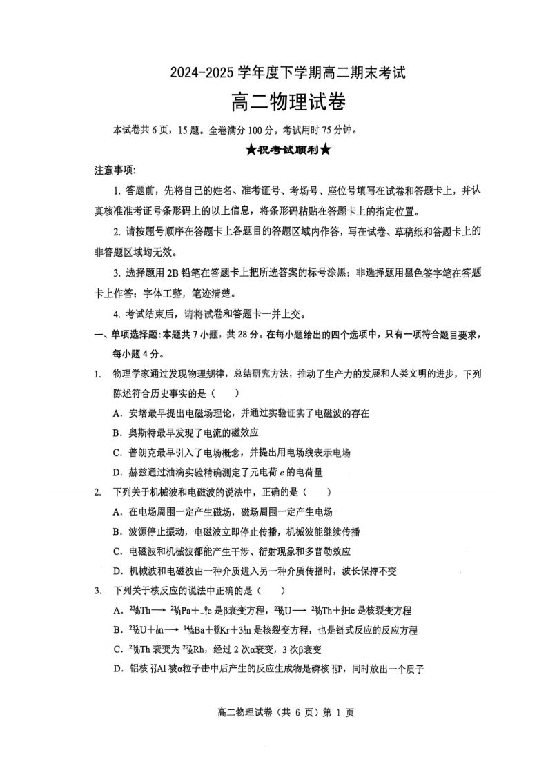 湖北省七市州2024-2025学年度下学期高二期末考试 物理试卷(含答案).pdf