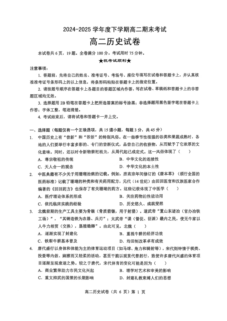 湖北省七市州2024-2025学年度下学期高二期末考试 历史试卷(含答案).pdf