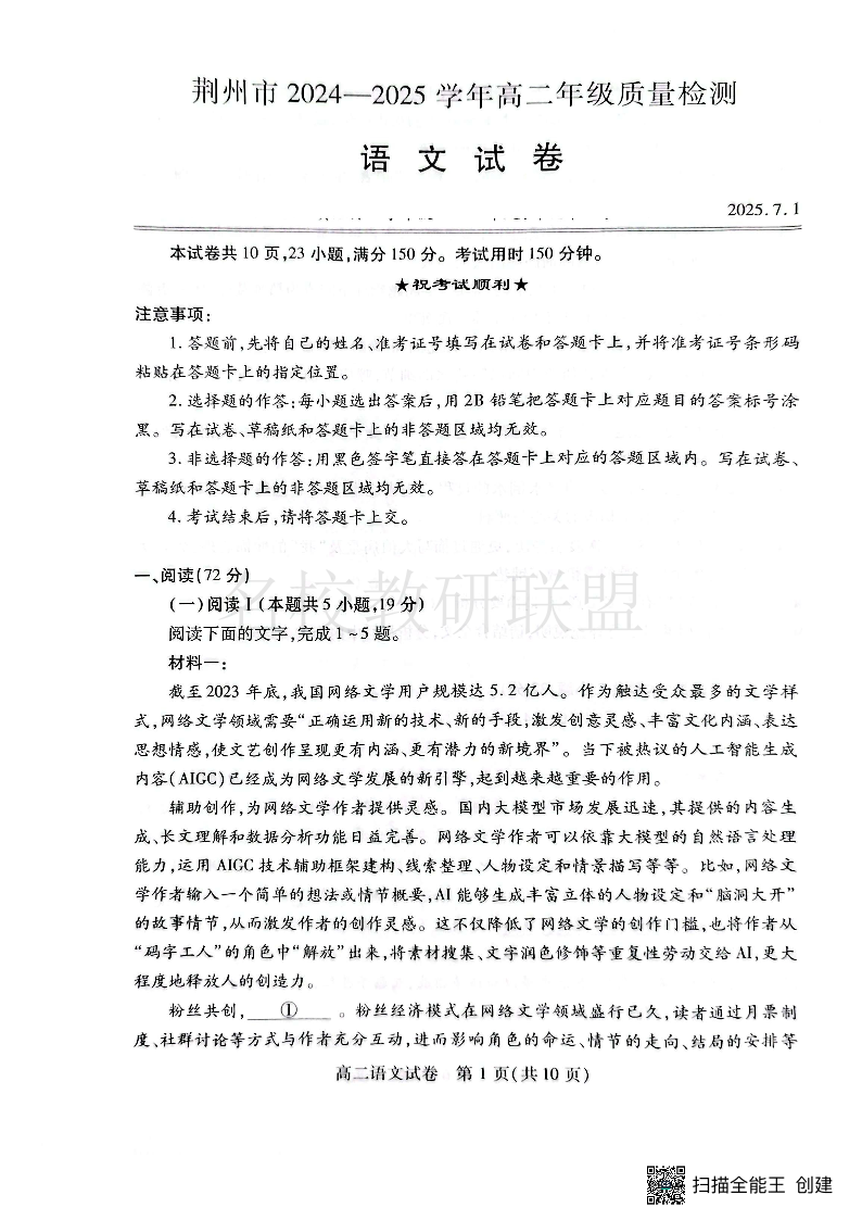 湖北省荆州市2024-2025学年高二年级7月期末质量检测 语文试题(含答案).pdf