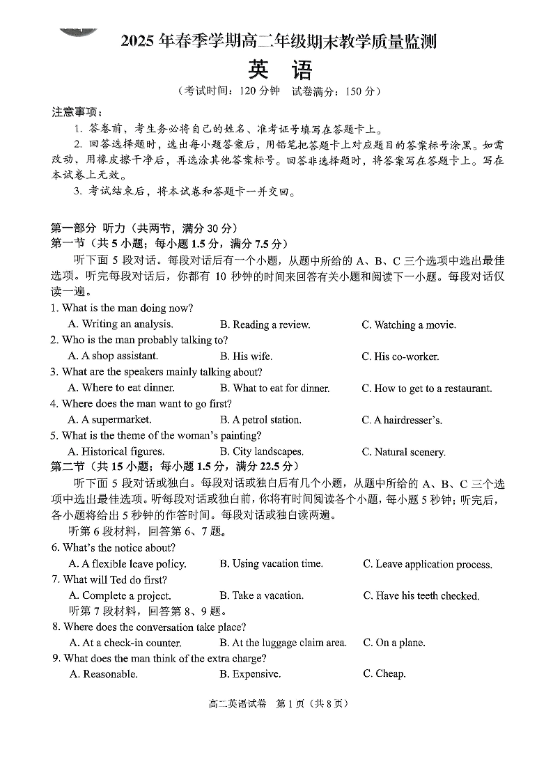 南宁部分学校2025年春季学期高二年级期末教学质量监测 英语.pdf
