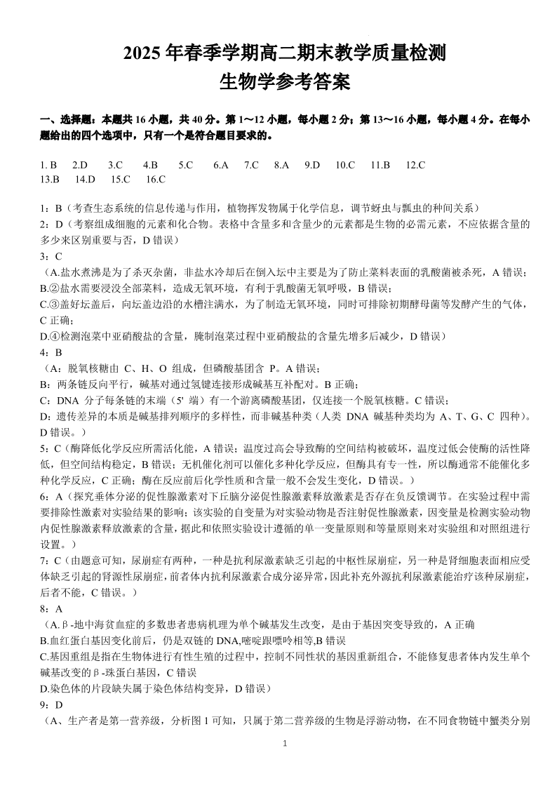 南宁部分学校2025年春季学期高二年级期末教学质量监测 生物答案.pdf