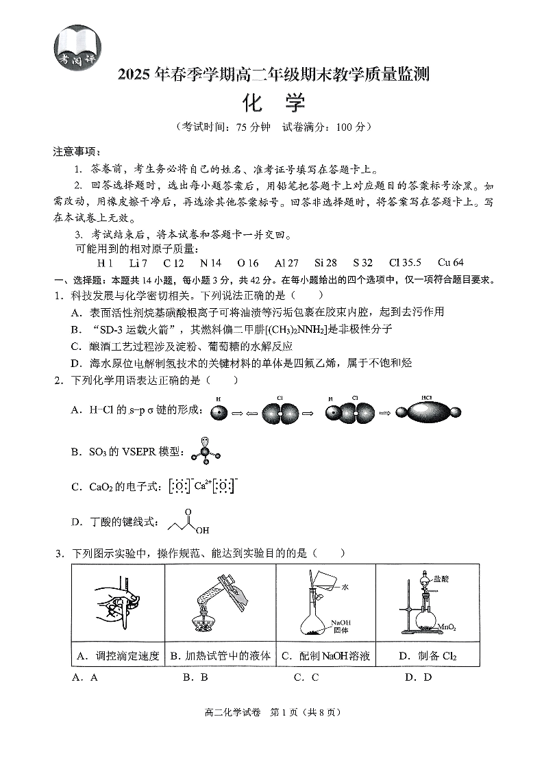 南宁部分学校2025年春季学期高二年级期末教学质量监测 化学.pdf