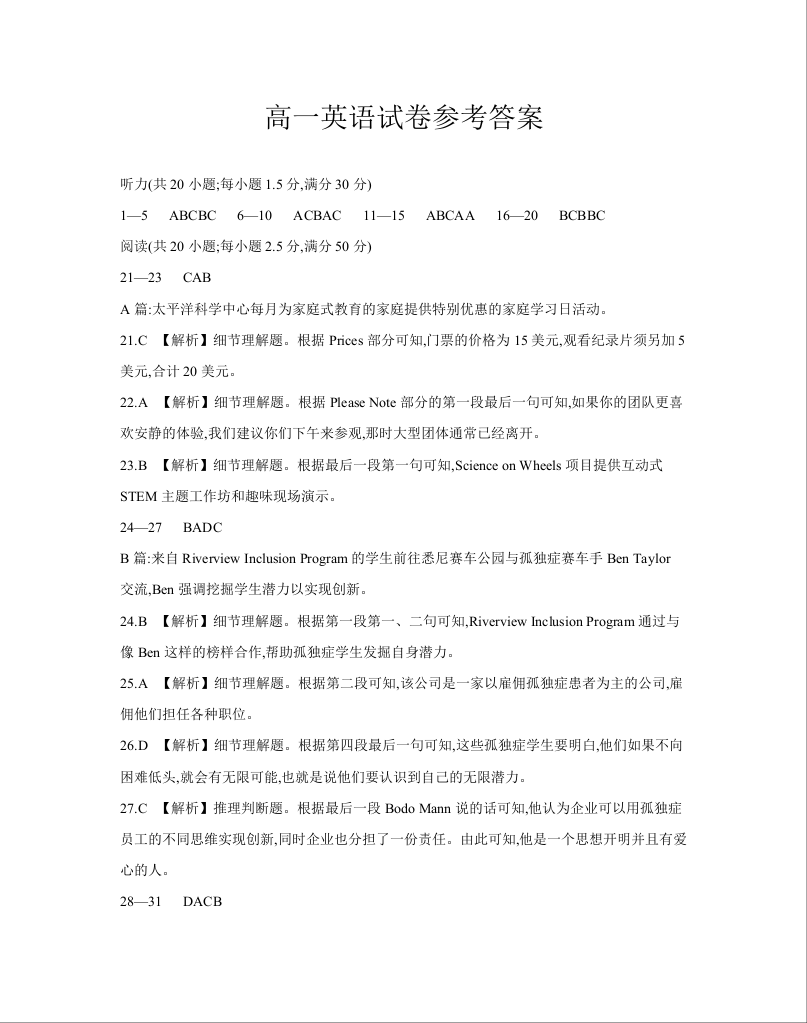 河南省2024-2025学年高一下学期6月百万大联考 英语答案.docx