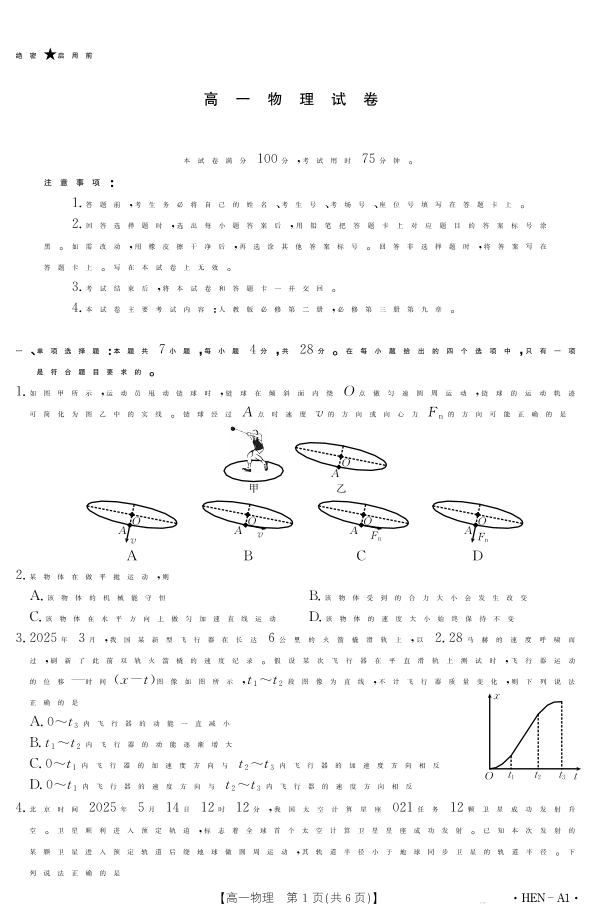 河南省2024-2025学年高一下学期6月百万大联考 物理.pdf