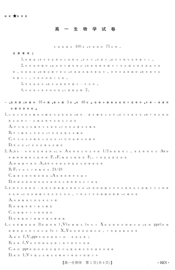 河南省2024-2025学年高一下学期6月百万大联考 生物学.pdf