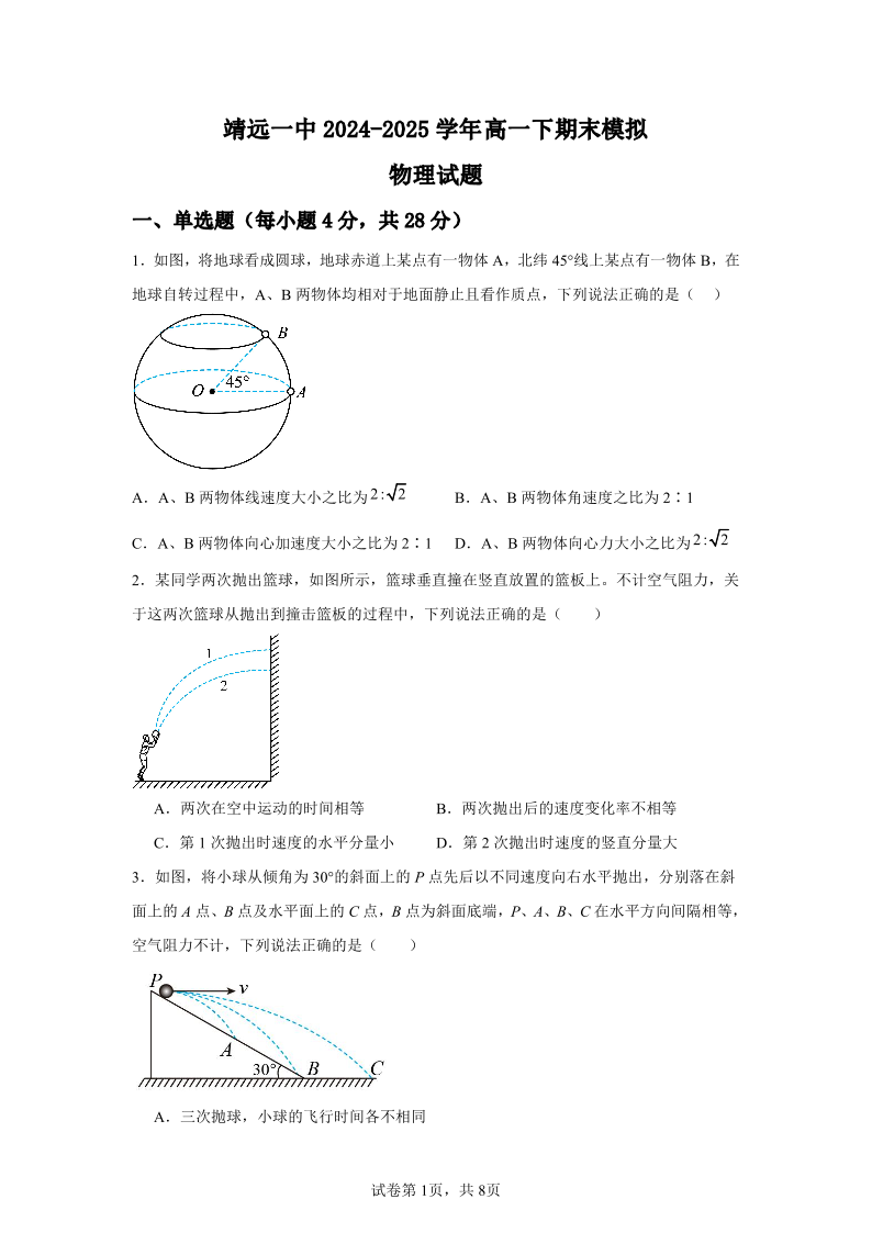 甘肃省2024-2025学年高一年级下学期期末考试模拟卷 物理.pdf