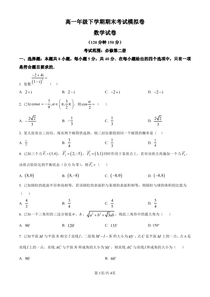 甘肃省2024-2025学年高一年级下学期期末考试模拟卷 数学.pdf