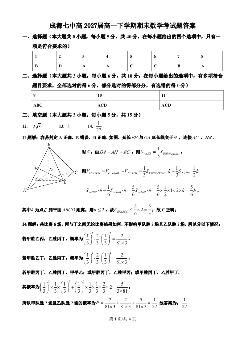 四川省成都市第七中学2024-2025学年度下期高一期末测试 数学答案.pdf