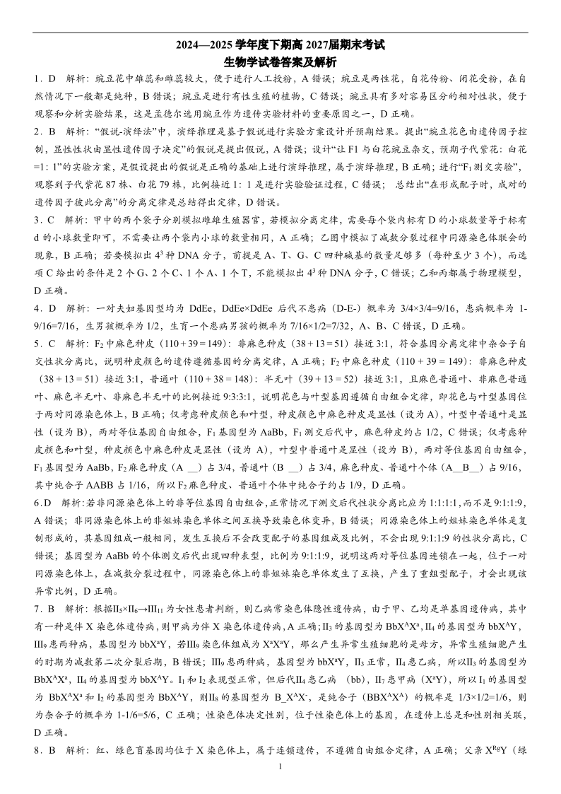 四川省成都市第七中学2024-2025学年度下期高一期末测试 生物答案.pdf