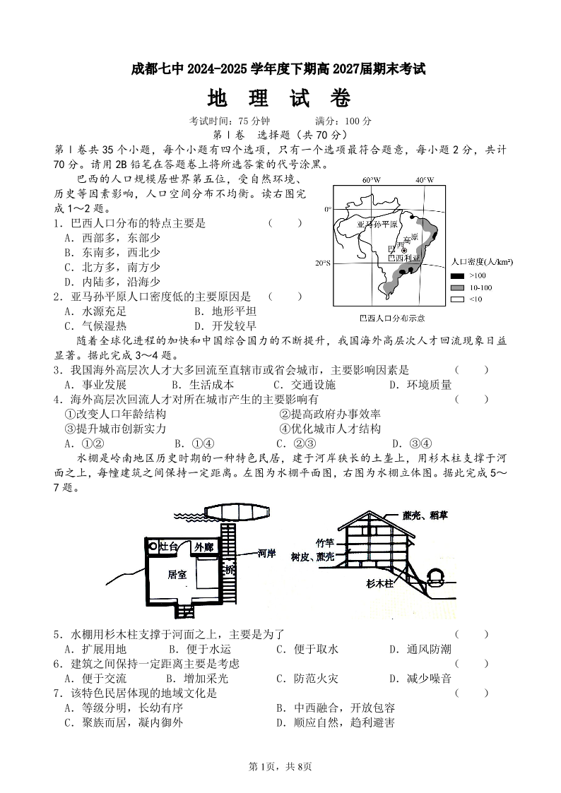 四川省成都市第七中学2024-2025学年度下期高一期末测试 地理.pdf