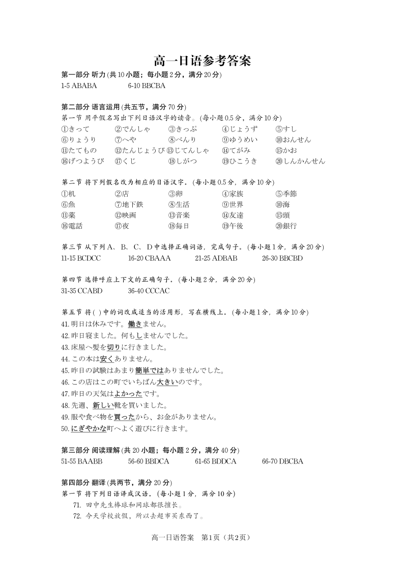 日语答案·2025年7月高一期末联考.pdf